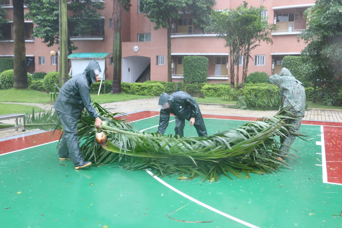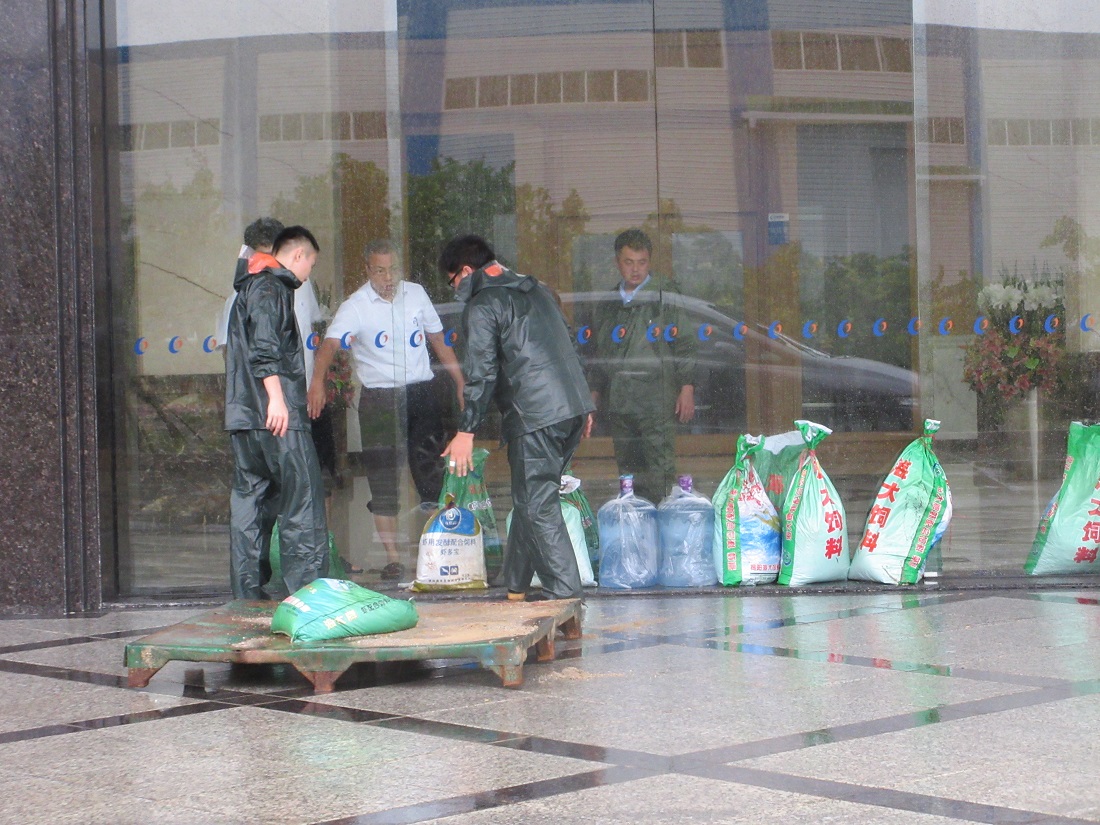 在台风到来之际,为保障员工的人身安全,公司决定全厂放假一天。21日上午,狂风暴雨持续肆虐,为保障公司的财产安全,在总裁办的指导下和吴总监的带领下,安全办、行政办、基建办、外联办及人力部的员工纷纷穿上雨衣雨鞋,两三人一组,在风雨中对厂区的防风措施落实情况和受灾情况进行巡回检查。同时,吴总监还带领部分人员到中德项目工地进行检查并布置了抗灾工作。