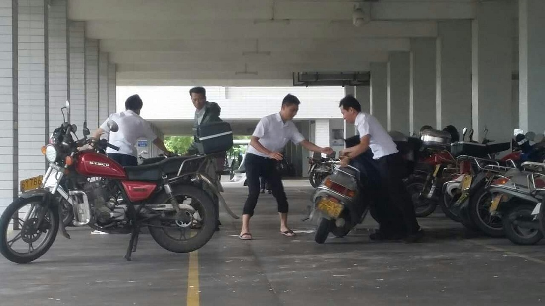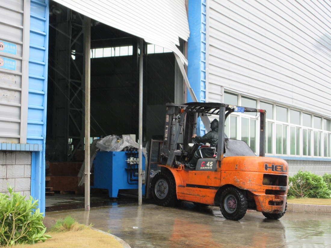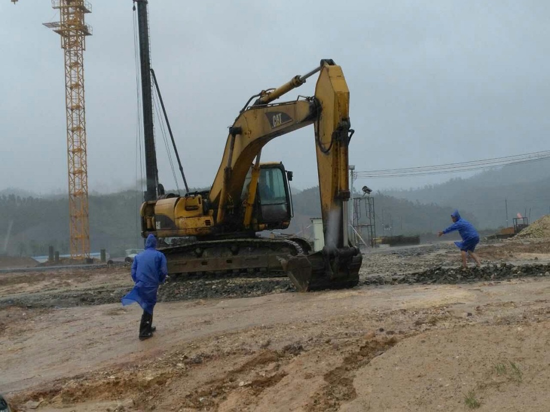 在大雨倾盆和狂风吹拂中,厂区内多处地方出现积水,而狂风也将树枝、树干纷纷吹断而横跨在道路中间。有的巡查人员不惧风雨阻挠,检查下水道口,处理积水现象,有的人员则清理路面上的障碍,将断树、断枝清理干净;中德项目工地抗灾人员也顶着风雨,使用挖土机挖掘排水沟,有效疏通积水。另外,巡查人员随时根据所发现的问题,联合生产、设备等相关部门加强防风措施和开展物资抢险,如落实使用沙包加固玻璃门和车间门、落实叉车搬移遭雨水淋到的工件、扶正停车场中被狂风吹倒的摩托车等多项工作。
