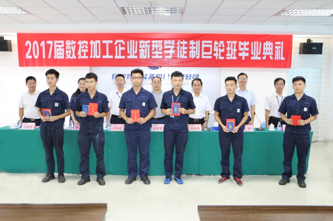 2015年夏天,我司与广州市机电技师学院联合开展企业新型学徒制人才培养,颇具人才培养前瞻性,是国内首创由企业与学校联合培养学徒的人才培养模式,走在了国家政策的前头。时光荏苒,两年的学习时间已经圆满结束,经学校技术团队与企业技术工程师共同开展考核、研究工作,准予巨轮班学徒毕业,并组织开展毕业典礼,为学员现场发放毕业证书和技能等级证书。