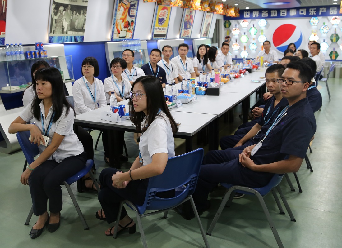 此次的行程主要分为三个部分:先由百事培训负责人孙丽娜小姐为巨轮到访人员介绍百事发展史,接着秦厂长带队参观生产线,最后与百事公司开展交流座谈会。进入百事揭东分公司,我们在百事人力资源负责人林旭芝小姐的引导下通过一条两边墙面挂满百事员工生活工作展示照片的旋转楼梯,来到他们日常举办各项文娱活动的博物馆。进门墙面的装潢瞬间就吸引了大家的目光,墙上贴着百事1898至2004年不同年代的LOGO让我们直观感受到其发展历史,玻璃柜里摆放的无数精美广告赞助产品犹如昭示着百事旺盛的营销实力,再往前墙面凸出来的三个大型饮料罐生动地告知我们百事出品的三种汽水产品:百事可乐、美年达、七喜。到访人员一边啧啧称奇,一边来到大厅中间的会议桌前入座,培训负责人孙丽娜小姐通过PPT演示清楚介绍了百事公司的主要业务、工厂发展史、揭东分公司配送覆盖区域、主要产品生产线以及最近一年的业绩回报,让我们看到了许多值得交流与学习的地方。